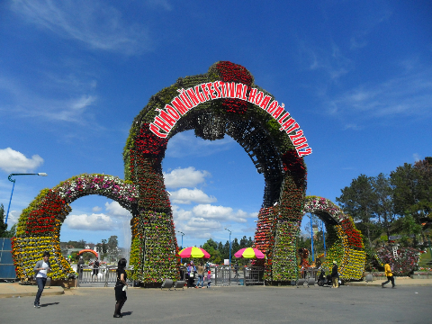 Cổng chào vườn hoa thành phố, được kết bằng hàng ngàn chậu hoa rực rỡ.