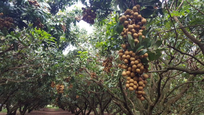 Những cây nhãn đứng thẳng tắp có hàng có lối, tán xòe phủ rợp bên trên. Nhãn trong vườn đang vào mùa sai oằn trái. Những chùm nhãn thấp cứ như muốn quất thẳng vào mặt khách nếu mình không biết né chúng khi chiếc golf car chạy qua, dù chầm chậm.