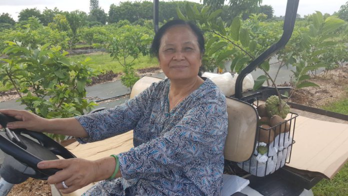Cóc Thái non không hột trong vườn Chín Nguyệt ở Homestead, Florida (Hình: Ngọc Lan/Người Việt) Cô Chín, ngoài 60, mang đậm chất miền Tây từ giọng nói, dáng dấp, đến sự nhiệt tình, chất phác. Không màu mè, không khách sáo. Đồng thời, “cô cũng là hiện thân của người nông dân thời hiện đại,” tôi nói với bà chủ vườn như vậy khi thấy cô điều khiển chiếc golf car chở khách đi thăm vườn một cách thuần thục, nhanh nhẹn.