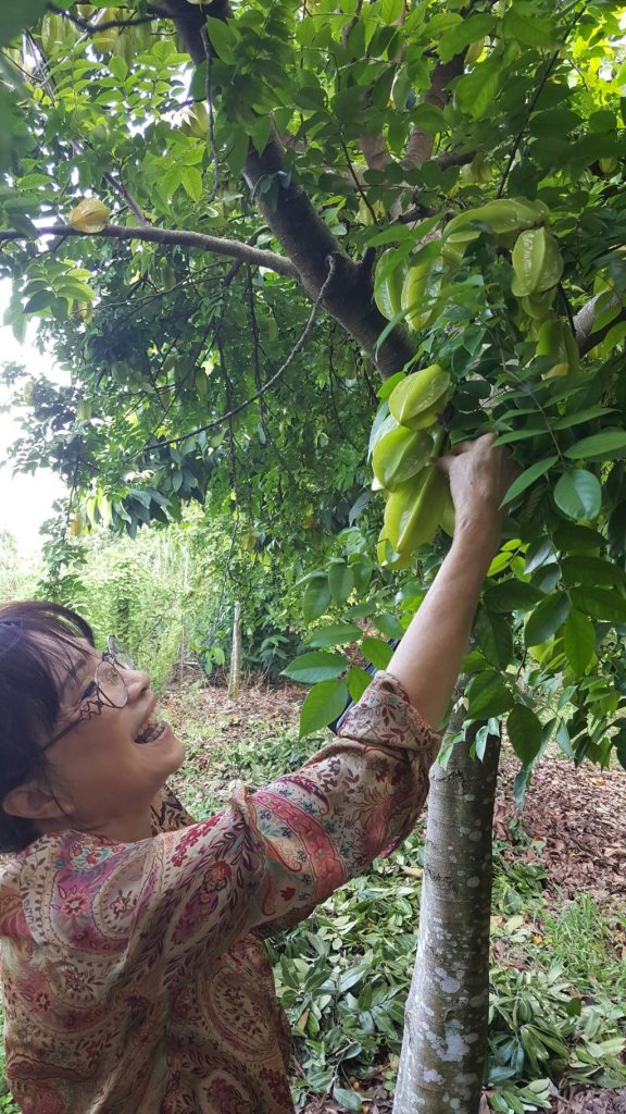 Vào vườn hái khế, một thú vui không dễ có ở Mỹ (Hình: Ngọc Lan/Người Việt) Rồi thì mít. Khế. Thanh long. Dưa gang. Cây nào trái nào cũng mang lại cho mình nét mặt hân hoan cùng nụ cười không dứt trên môi.