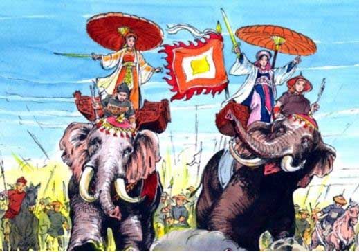 Hai chị em Bà Trưng là Trưng Trắc và Trưng Nhị, quê quán làng Cổ Lai, đất Mê Linh. Lúc ấy nước nhà đang bị người Tàu cai trị bằng chính sách hà khắc khiến dân ta vô cùng khốn khổ. Rồi vào năm 40, sau Tây Lịch, Thái Thú Tô Định lại bắt giết ông Thi Sách, chồng Bà Trưng Trắc làm cho nợ nước chồng chất thêm thù nhà cho nên Bà Trưng Trắc cùng em là Bà Trưng Nhị đứng lên chiêu tập binh mã, anh hùng hào kiệt khắp nơi để đánh đuổi quân xâm lăng bạo tàn. Quân binh của Hai Bà chiến đấu rất dũng mãnh, chiếm được 65 thành, đánh đuổi quân Tô Định chạy về Tàu. Sau khi đánh đuổi được quân xâm lăng ra khỏi bờ cõi, dân chúng tôn Bà Trưng Trắc lên làm Nữ Vương, đóng đô ở Mê Linh. Đến năm 42, vua Tàu là Quang Vũ nhà Đông Hán sai Mã Viện kéo quân qua phục thù. Trước địch quân hùng hậu, quân ta chống cự không lại nên Hai Bà đã gieo mình xuống giòng Hát Giang tuẫn tiết. Không có hình ảnh nào vừa hào hùng, vừa lãng mạn cho bằng hình ảnh của hai vị liệt nữ anh hùng gieo mình xuống giòng nước trả nợ núi sông và để lại gương “Thiên thu thanh sử hữu anh thư”. Hai Bà Trưng làm vua được 3 năm, từ năm 40 đến năm 43. Khi vua Tự Đức đọc đoạn sử Hai Bà Trưng, ngài đã ngự phê: “Hai Bà Trưng thuộc phái quần thoa thế mà hăng hái quyết tâm khởi nghĩa làm chấn động cả triều đình Hán. Dẫu rằng thế lực cô đơn, không gặp thời thế nhưng cũng đủ làm phấn khởi lòng người, lưu danh sử sách”. Và Đại Nam Quốc Sử Diễn Ca đã ghi lại công nghiệp của Hai Bà bằng những vần ca dao lịch sử: