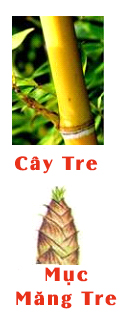 TRE : Việt Nam có nhiều loại như : Tre Mạnh Tông, Tre Gai... thân Tre cao lớn thường để làm nhà hoặc đan những dụng cụ để xài như : Thúng, đăng, đó, giỏ, cần xé, nơm, nia, sàng, sề, rổ, lờ... cho nên trong dân gian thường thấy như :