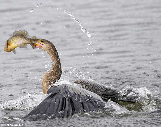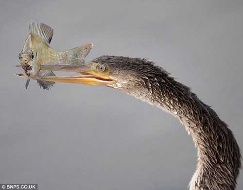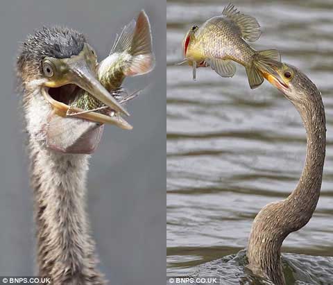 - Chim cổ rắn có thể bơi giống như một chiếc tàu ngầm với cả thân mình chìm dưới nước và cổ của nó chỉ nhô ra khi phát hiện thấy con mồi, rồi đâm phập vào mục tiêu của mình một cách đột ngột. Cảnh tượng đáng kinh ngạc này được chộp lại bởi Alfred Forns một nha sĩ 64 tuổi tới từ Florida