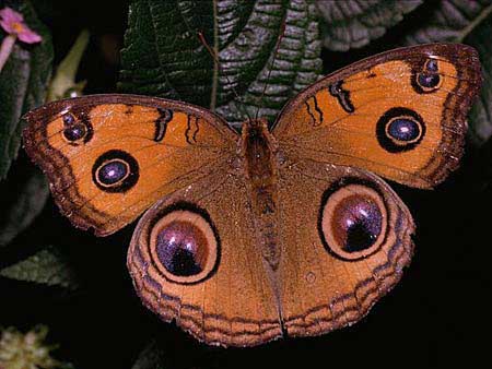 Bướm lông công (Junionia almana) nổi bật với những mắt lớn giống trên lông công và màu tía.
