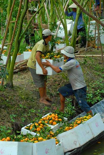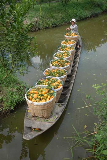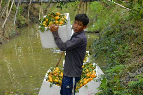 Xuồng ba lá chuyển các sọt quýt vừa thu hoạch ra bến đế thương lái mua.
