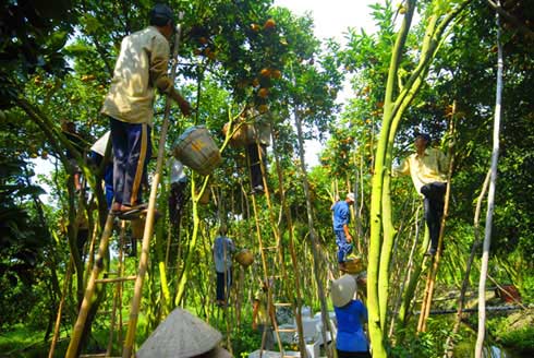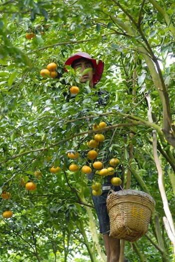 Nông dân mang theo những chiếc giỏ trèo lên cây hái quýt