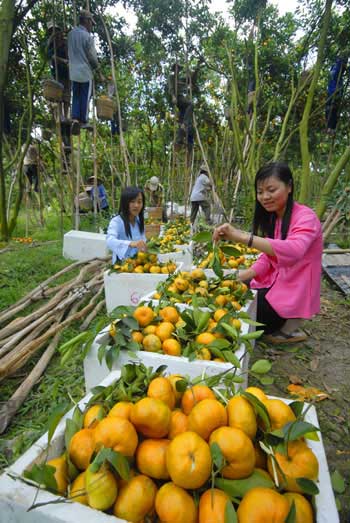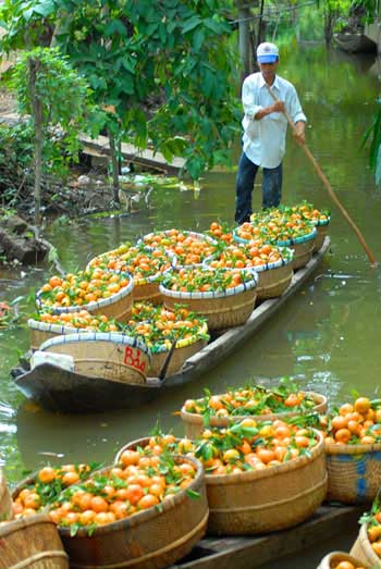 Khoảng 40.000 tấn quýt đang chín đỏ cành ở các nhà vườn huyện Lai Vung, tỉnh Đồng Tháp, được nhà nông hối hả thu hoạch đến bán Tết. Xuồng ghe tấp nập ghé bến mua quýt.