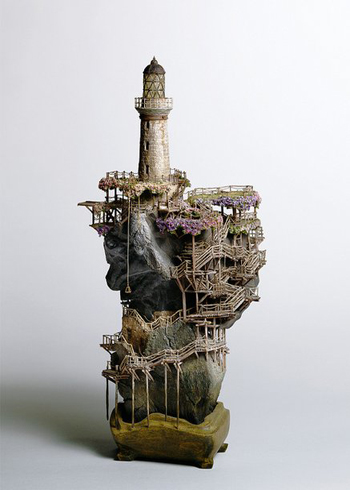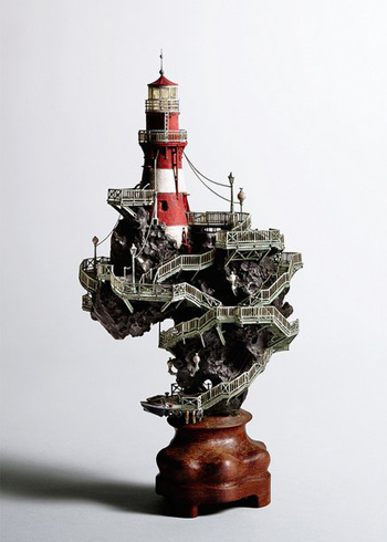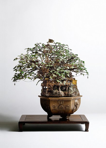 Các tác phẩm của nghệ nhân Nhật Bản Takanori Aiba thoe trường phái Nghệ thuật thực nghiệm kết hợp những mô hình khách sạn, lâu đài, thành phố... với cây cảnh tạo nên những chậu bonsai độc đáo.
