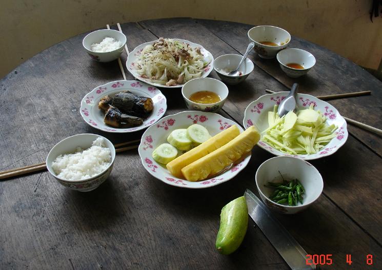 Vì lưỡi câu không có ngạnh, khi cá bị dính và vụt lên, cá liền văng ra phía sau. Mẹ tôi cứ tiếp tục vụt, những con cá bạc lấp lánh cứ tiếp tục bay lên và anh em tôi chạy lăng xăng, rối rít bắt cá bỏ vào thau nước. Tuổi thơ chúng tôi rộn ràng trong những ngày vui như hội. Trưa hôm đó mẹ tôi làm món cá lòng tong xào dấm. Mẹ tôi sai tôi ra vườn bẻ mớ rau, chính yếu là rau cải trời, rau ngò gai, rau húng. Những thứ nầy mọc sau vườn lẫn trong cỏ và nhiều như cỏ. Cắt thêm vài cọng hẹ là xong.