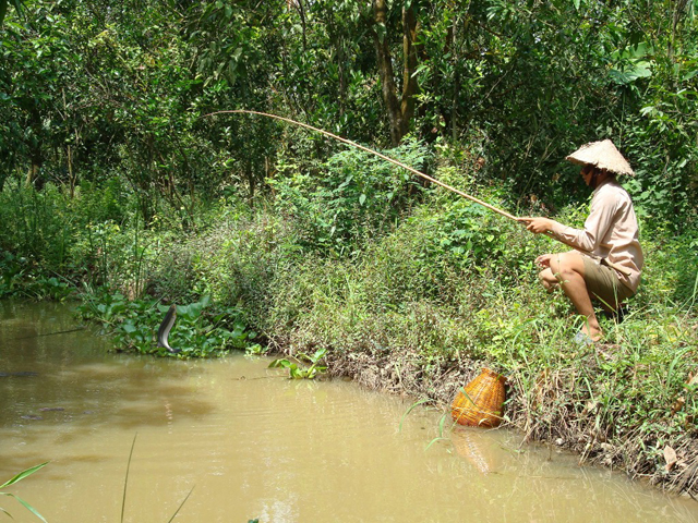 Có khi cá cũng lại ăn mồi trùng của chúng tôi. Nhưng nhìn cách ăn câu chúng tôi biết được đó là con cá hay con tép. Con cá ăn câu thì cần câu sẽ giựt xuống rồi bật lên. Con tép ăn câu thì cần câu gục xuống rồi giữ ở đó, còn cọng chỉ nhợ câu quây vòng vòng vẽ theo một cái hình nón. Khi mình lại dùng rổ hớt, con cá thường chạy đi, con tép thì vẫn đeo mồi. Câu tép như vậy không nhiều, bữa nào trúng mùa lắm cũng chỉ được 10-20 con tép, mỗi con to bằng ngón tay.