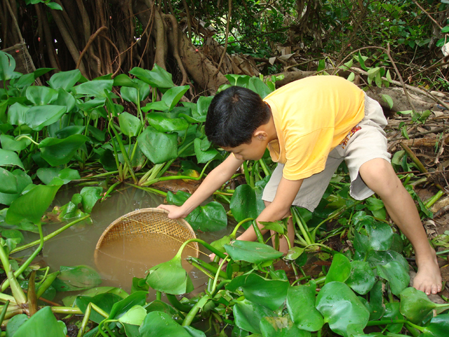 Anh em tôi còn một thú vui nữa là câu tép. Ðầu mùa nước nổi khi nước bắt đầu ngập sát mé bờ sông, anh em tôi chuẩn bị đi câu tép. Cần câu chỉ là một cọng lá dừa chuốt nhỏ, lớn bằng cọng chân nhang, dài chừng 4 tấc. Ðầu nhỏ của cọng lá dừa quấn lại thành một vòng tròn bằng chiếc nhẫn đeo tay. Cột vào đầu “cần câu” là một sợi chỉ dài chừng 3 tấc. Không có lưỡi câu, nhưng thay vào đó là một vòng tròn dây kẽm nhỏ, luồn dọc thân một con trùng làm mồi . Chúng tôi tự chế tạo 5-6 cái cần câu … nội hoá như vậy và bắt đầu đi câu .