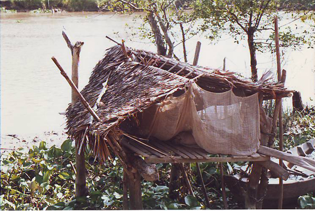 Tôi lội ra đám cỏ, bắt mấy con cào cào, xong xách cần câu trở lại cái chõng nơi các em tôi ngồi chờ. Em gái tôi đứng bắt mấy con nhện trên vách lá. Từng tốp cá lòng tong bơi lượn loang loáng dưới chân giường. Lấp ló bên vách nhà, mấy con cá rô đang lượn lờ, thỉnh thoảng vọt lên mặt nước đớp mồi rồi lặn nhanh mất dạng. Tôi móc mồi bỏ xuống và giật lên một con lòng tong. Thằng em tôi lấy cái nồi ở đầu giường, múc nửa nồi nước cho tôi bỏ cá vào. Chúng tôi thay phiên câu cá. Người rình nhử cá, cá rình xem người làm rớt đồ ăn xuống nước là xúm lại đớp mồi.