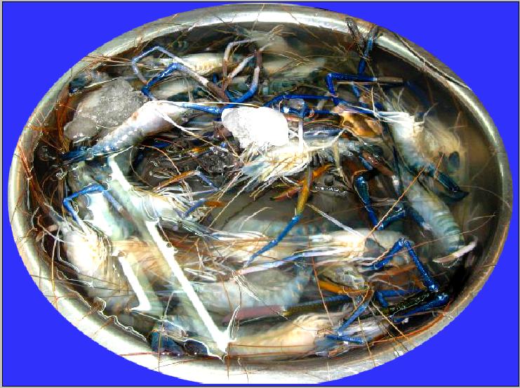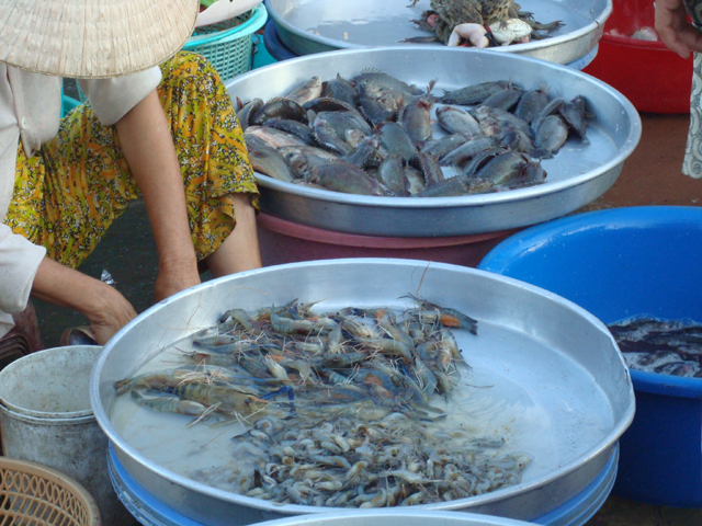 Tôm và tép nước ngọt đang được bày bán ở chợ quê