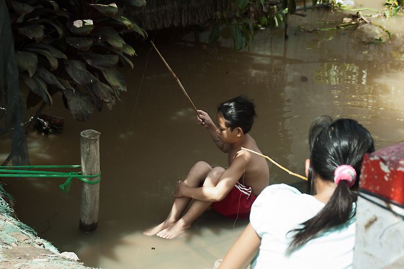 Ngồi lâu chán, anh em tôi rủ nhau câu cá từ trên giường ngủ. Phần lớn chúng tôi câu được cá lòng tong. Nhưng nếu khéo léo giữ yên lặng, tôi có thể câu được những con cá lóc, cá rô lội vô nhà kiếm ăn. Bữa cơm hôm đó mẹ tôi nấu cơm trên bộ ván mà ba tôi kê tạm mấy ngày trước đó, chúng tôi ăn cơm với cá lòng tong kho tiêu, một con chuột đồng nướng, vài đọt rau muống mới hái bên hông nhà. Nước ngập, chuột đồng hay lên ngọn cây làm ổ, nên ba tôi hay đâm được chuột trong mùa nước . Mùa nước nổi khổ sở cho người lớn, nhưng lại thú vị cho bọn con nít chúng tôi. Người lớn phải lo chuẩn bị kê bồ lúa lên cao, chuẩn bị gạo thóc, củi đuốc, bắt cầu tre làm xa lộ đi trong nhà cho nền nhà không hư. Nhưng bọn con nít được nghỉ học, được bơi xuồng trong xóm trong nhà. Ðược câu cá, bắt chuột suốt ngày, đời vui như… Tết.