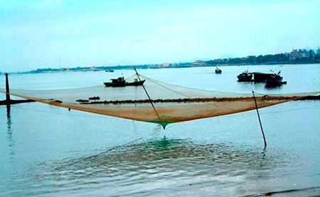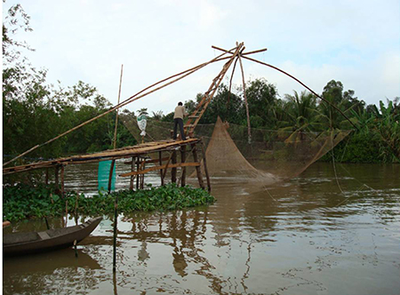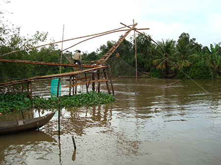 Một người thợ vó đang nâng vó lên để bắt cá.