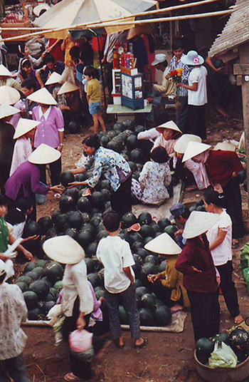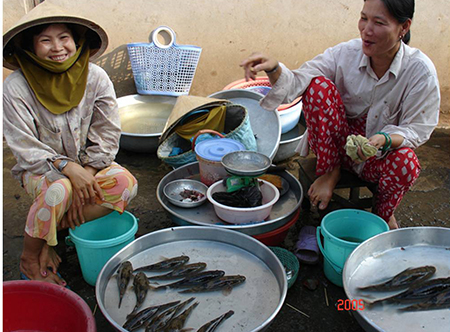 Đứa trẻ bằng tuổi tôi nhanh nhẹn đứng lên cầm cái thau nhôm nhỏ múc cá từ trong lu đổ vào cái thau nhôm lớn cho ba nó. Từng đợt cá rô non màu vàng lóng lánh được chuyển lên chợ xã bán. Trên chiếc ghe có ba cái lu da bò. Mỗi lu có đến gần một trăm ngàn con cá rô non nhỏ dẹp bằng ngón tay cái sẽ được bán hết trong buổi chợ ngày hôm nay. Loại cá nầy chỉ cần bỏ vô rổ, dùng một miểng dừa chà sơ cho sạch vảy rồi đem kho tiêu, kho xã hay lăn bột chiên. Tôi chưa được tận mắt thấy cảnh bắt cá rô non, nhưng theo lời kể của đứa nhỏ thì ngày hôm qua gia đình nó bơi dọc bờ kinh dùng vợt hớt cá rô non để hôm nay ra chợ bán. Nó nói trong miệt kinh, cá rô non nhiều vô kể, năm nào cũng đem lại cho gia đình nó một số tiền. Hôm nay mẹ tôi đi chợ, phần tôi ngồi giữ xuồng và được làm quen với nó.