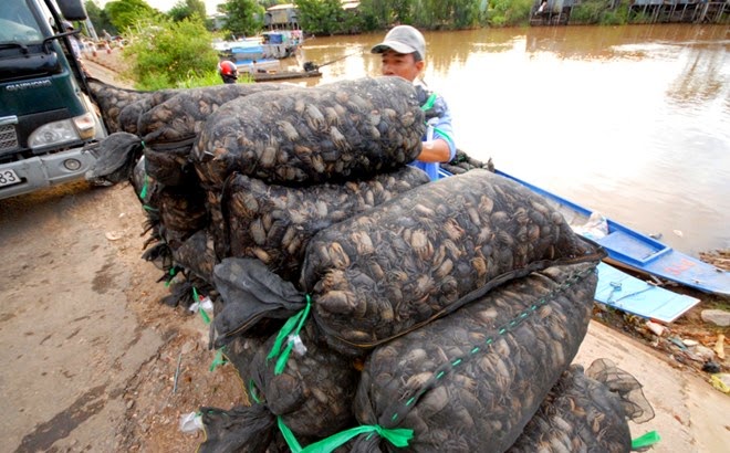 Giá cua mùa lũ loại thấp nhất chỉ từ 5.000 đến 6.000 đồng/kg. Anh Trương Nguyễn Cảnh, ở huyện Tân Hưng – Long An, cho biết, mỗi ngày anh đặt 400 cái lợp (dụng cụ bắt cua) bắt trên 150 kg cua rồi chuyển về chợ bán sỉ cho thương lái .