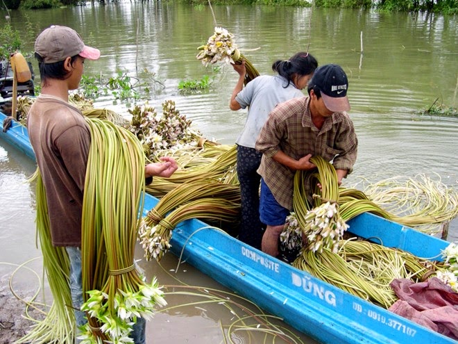 Bạn có thể bắt gặp những người dân An Giang mưu sinh theo con nước, chạy vỏ lãi tới các cánh đồng giáp biên để hái bông súng đồng. Những bông súng mọc trên đồng mùa này có thể dài tới ...4-5m!