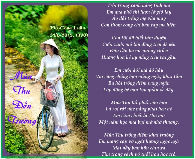 Mùa Thu đến, mùa của tựu trường. Cô gái nầy được mẹ may cho áo dài mới khoe cùng bè bạn. Cô vui cùng chúng bạn chợt nổi lên ba tiếng trống báo hiệu sắp đến giờ vào lớp.Sau ba tháng hè xa cách mấy cô có trăm ngàn chuyện để kể cho nhau nghe. Họ còn viết lưu bút hoặc lưu ảnh. Còn đi học tức còn hưởng thời vàng son. Bài thơ với giọng văn nhẹ nhàng như tâm trang vui vẻ của mấy cô cậu học sinh.Cám ơn Đỗ Công Luận. Nguyễn Thành Sơn