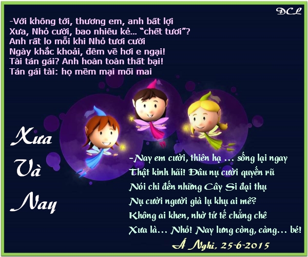 Đọc bài Nhớ Quá Sài gòn,tôi ghi lem nhem đôi dòng góp vui với bà con. Tôi định đi nghi lại đọc bài xưa và nay qua tranh của ĐCL. Cô bé trong thơ có bùa phép gì khi cười khiến thiên hạ ".chết tươi".Cô tiết lộ với người tình: muốn tán tỉnh cô phải nhờ mai mối chứ không thể chọc ghẹo mà thành công. Cũng ý tứ!. Ngày nay khi cô cười "thiên hạ sống lại ngay. Tôi tâm đắc câu: "Xưa là nhỏ Nay lưng còng càng...bé" lối chơi chữ qúa hay. Thân chào Á Nghi Nguyễn Thành Sơn