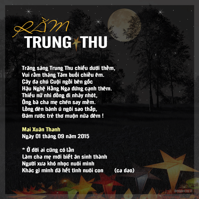 Ý thơ phù hợp với ngày Rằm Trung Thu, lại được trình bày rất mỹ thuật trong một khung thơ tranh, mà hình ảnh đèn lồng, bối cảnh rặng cây dưới ánh trăng giữa một bầu Trời trăng sao lấp lánh, trông rất thơ mộng. Một khung thơ tranh sinh động. Thân chào . Như lâm
