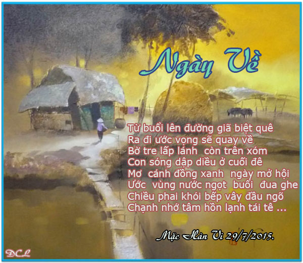Ngày đi,giã biệt mái tranh quê Ước hẹn ngày nao sẽ trở về Cò trắng lượn lờ quanh mép ruộng Mục đồng thổi sáo ở chân đê Gió căng diều lượn trên đồng cỏ Nước cạn khỏi bờ cá khẳm ghe Lãng đãng khói lam nhà nhẹ toả Lòng buồn thương nhớ quá bên tê