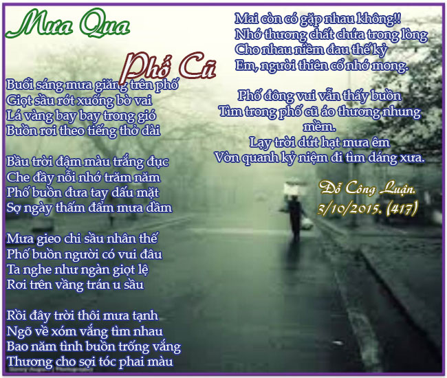 Mưa buồn, phố cũ, đã làm tôi tức cảnh sinh tình nhớ đến người xưa. Em giờ đã xa xôi...ĐCL