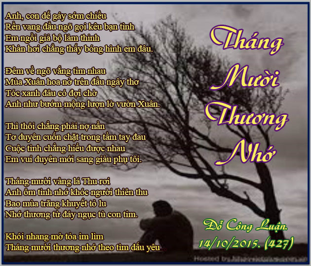Tháng mười thuơng nhớ. Vì thương nhớ cô em, mà dòng thơ của tác giả trở nên trử tình, nhưng buồn và lãng mạn lắm! Khi người yêu vui duyên mới vì giàu sang mà phụ rải tình mình thì còn xứng đáng gì mà phải: "Anh ôm tình nhớ khóc người thiên thu" ! Đúng là một người si tình !!. Trân trọng chào. Phương Võ.