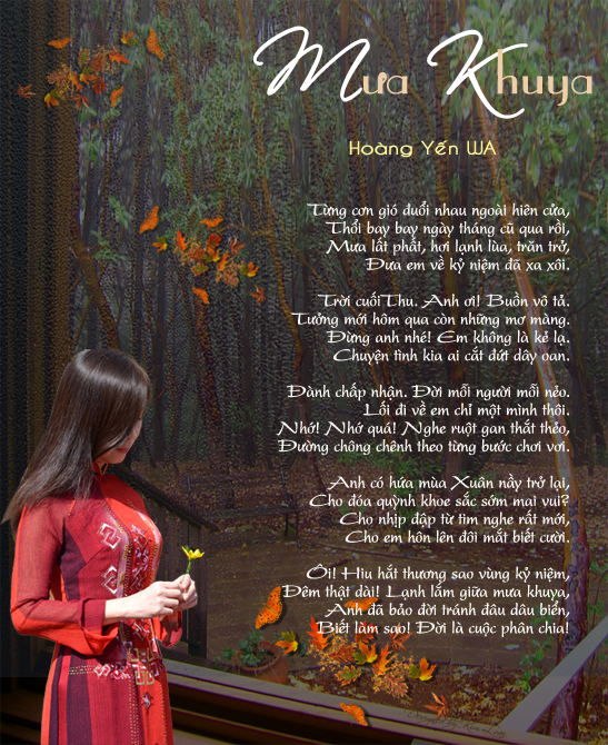 Thơ hay,truyền cảm,duyên dáng và dễ thương lạ ! Tranh lại quá đẹp.Đúng là nghệ thuật ! Hình ảnh rõ nét,màu sắc hài hòa.Nhìn ra khung cửa ta cảm nhận mưa lất phất bay với những chiếc lá vàng rơi lả tả đã nói lên được tâm trạng cô em. "Trời cuối thu.Anh ơi!Buồn vô tả ! Tuyệt vời! Chân thành cám ơn hai cô. Giang Võ.