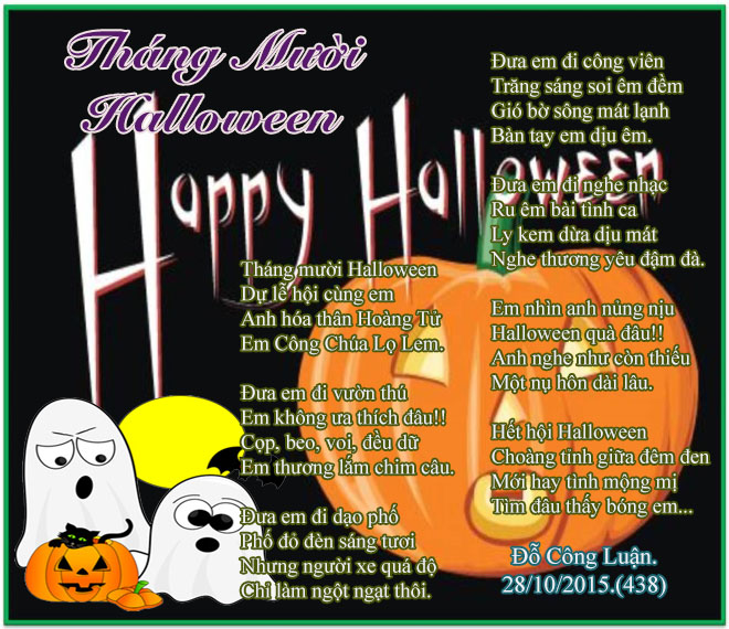 Thơ hay,diễn đạt lại tục lệ Hóa Thân trong ngày Halloween và được thiết kế trong một khung tranh đẹp,màu sắc, hình ảnh rõ ràng thể hiện nét đặc thù của ngày lễ Halloween. Thân chào. Hùng Trần