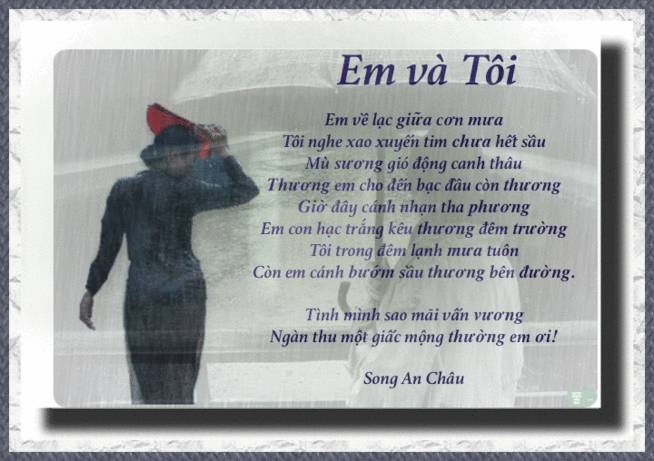 Khung thơ tranh được trình bày mỹ thuật bằng sự lấp ghép hình khéo, đưa người thưởng ngoạn cảm nhận được nét hài hòa của khung tranh thơ khi cô em chia tay trong cơn mưa,hòa với dòng thơ trử tình và lãng mạng duyên dáng: "Thương em cho đến bạc đầu còn thương" để rồi tác giả quay về với thực tế: "Tình mình sao mãi vấn vương Ngàn thu một giấc mộng thường em ơi !". Trân trọng chào. Hùng Trần.