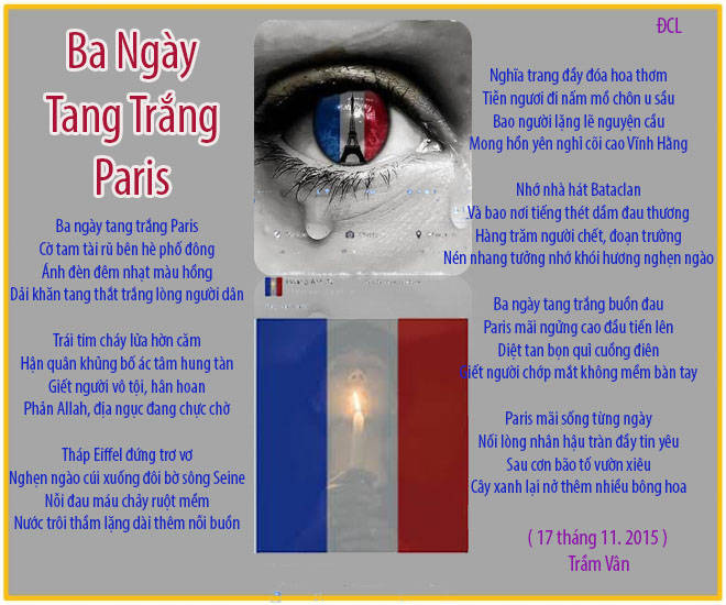 Thơ hay, Khung thơ tranh với kỷ thuật ghép ảnh khéo đã làm cho hình ảnh màu sắc diễn đạt được ngày đau thương tang tóc của người dân Paris nói riêng và cả nước pháp nói chung, trước sự khủng bố tàn bạo của bọn quá khích IS! Cảm ơn hai vị. Thiên Lê