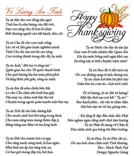 Từ khi sinh ra đời đến lúc trưởng thành con người đã thọ ơn cuộc đời không sao kể siết. "Ôi vô lượng,ôi ơn đời vô lượng !. Một lần sao nói hết " Tạ ơn " Một khung tranh đẹp trang nhã với lời thơ thật hay,ý thơ thâm thúy đây suy gẫm. Kính cám ơn. Giang Võ