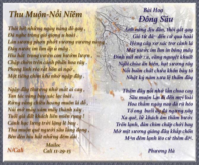 Bài xướng nói lên nổi miềm thương nhớ khi Thu đến. Bài hoạ bày tỏ nội tâm của mình khi Đông về. Cả hai xướng và hoạ đều hay, trử tình. Nhưng cả hai đều đượm nét u buồn! Thơ dài là điều khó khăn để thực hiện khung tranh.Nhưng ở đây ta thấy ngưới tạo tranh dùng kỷ thuật ghép hình khéo làm nền cho hai bài thơ để diển đạt trọn vẹn cái nổi u buồn của hai nhà thơ trong cảnh ảm đạm của mùa Thu cùng cái lạnh tê tái của mùa Đông mù mịt sương giăng. Trân trọng cám ơn. Phương Võ.