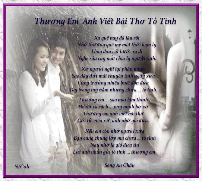 Song An Châu sở trường về thơ Lục Bát.Thơ của anh giản dị như ca dao tục ngữ nhưng ẩn hiện hình bóng của một thiếu nữ, nói rõ hơn là người yêu của anh. Tình yêu của lứa tuổi học trò trong trắng, thánh thiện. Anh từng:"Tay trong tay nắm vẫn chưa ... tỏ tình. Cô bạn phải nhắc nhở:" Thương em ... sao mãi làm thinh". Tôi lại thắc mắc: Đã tay trong tay mà nói chưa tỏ tình chỉ có...mới tin.(Đùa tí cho vui) Tranh của Nắng Cali tòan màu xám lợt, phải chăng cô muốn diễn tả hai anh chị đã yêu nhau vẫn chưa tỏ tình. Đây phải chăng là chất xám của tình yêu? Chúc Song An Châu,Nắng Cali mùa Giáng sinh Hạnh Phúc, mọi mong ước sẽ thành sự thực. Nguyễn Thành Sơn