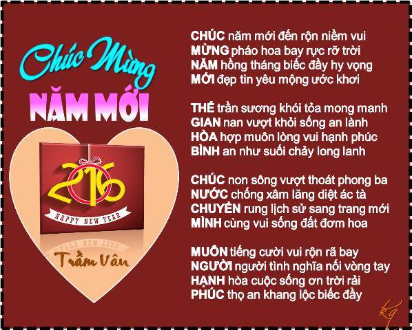 Cảm ơn tác giả Trầm Vân đã dùng lời thơ ngọt ngào và truyền cảm để chúc mừng năm mới cho thế giới hòa bình, cho quê nhà chuyển mình cùng nhau chống xâm lăng diệt ác tà để lịch sử sang trang và muôn người sống trong Hạnh Phúc.Khung tranh đẹp, ý nghĩa. Trân trọng kính chào. Hùng Trần
