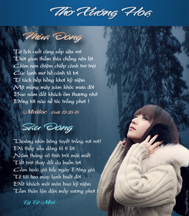 Cả hai bài thơ xướng và hoạ về mùa Đông đều mang âm hưởng của một điệu nhạc buồn,gợi nhớ về kỷ niệm nơi quê nhà trong chuổi ngày sống nơi đất khách khi mùa ĐÔNG đến. Nổi buồn càng thắm thía hơn khi tuổi đời ngày càng chồng chất! Thơ lại được lồng trong một khung tranh thật đẹp mà hình ảnh và màu sắc được thiết kế rất mỹ thuật. Trân trọng cám ơn. Phương Võ