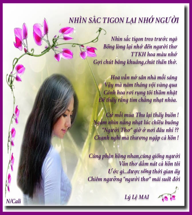 Lệ Mai cũng xin cám ơn Nắng Cali đã cho một khung tranh thơ tuyệt đẹp và "người thơ" bên cành hoa tigon .Đã làm cho bài thơ them hương sắc.