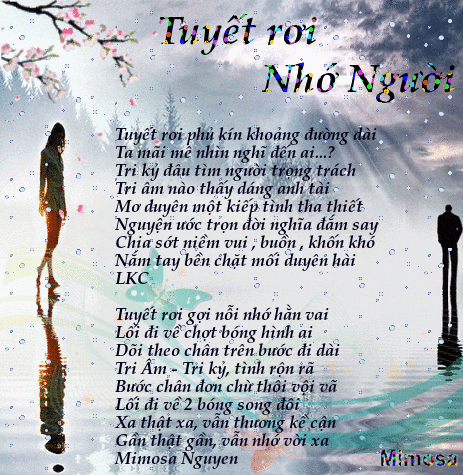 Cả hai bài thơ đều hay,thi vị và thật trữ tình với LKC thì thủy chung "Nguyện ước trọn đời nghĩa đắm say " Nhưng với Mimosa Nguyễn thì pha chút lãng mạn đáng yêu " Xa thật xa, vẫn thương kề cận Gần thật gần, vẫn nhớ vời xa " Khung thơ tranh với ảnh động cảnh tuyết rơi,sóng gợn trên mặt nước,cùng với hai hình bóng người thật mỹ thuật. Nhà thơ nhìn tuyết rơi rồi liên tưởng đến người thương(qua hình bóng) một cách rất thú vị.Thân chào. Cám ơn. Giang Võ