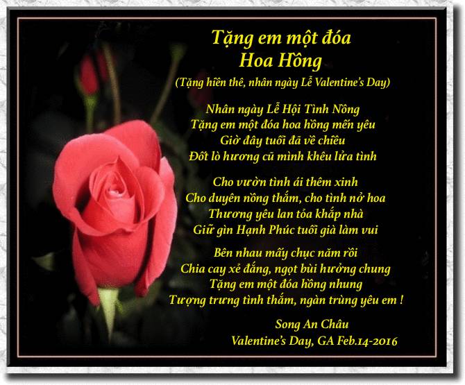 Lễ Tình Nhân ủ thơm nồng, Vợ nhà xin tặng hoa hồng dấu yêu. Nhành mai vóc liễu xế chiều, Quen hơi bén tiếng chắt chiu mối tình. Tào khang mai trúc thêm xinh, May duyên đầm ấm đôi mình kết hoa. Cùng nhau xây đắp nên nhà, Gìn vàng giữ ngọc về già cũng vui. Trải qua bốn chục năm rồi, Biết bao cay, đắng, ngọt, bùi, có chung. Sống còn xa cách nhớ nhung, Hoa hồng tươi thắm rất mừng tặng em.