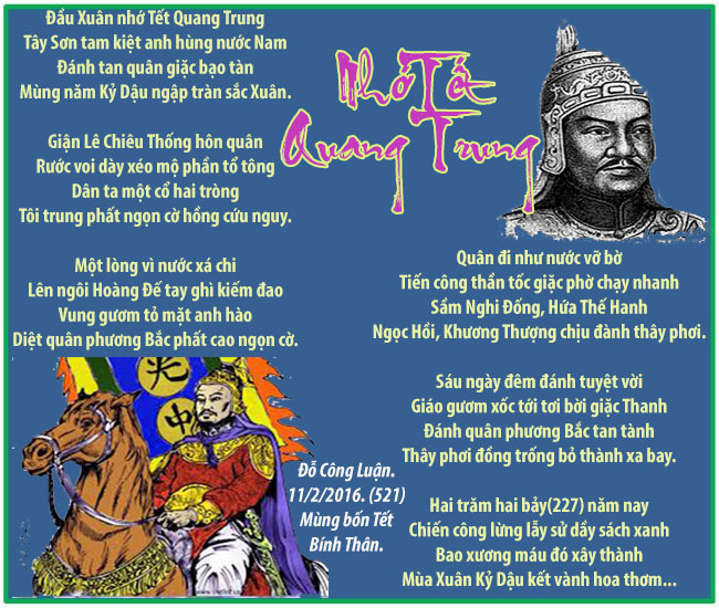 Cảm ơn tác giả ĐCL đã cho đọc một bài thơ hay và thật ý nghĩa để nhắc nhở con cháu đời đời nhớ đến Trận Đánh Lịch Sử và Chiến Thắng Vẻ Vang ngày mùng 5 Tháng Giêng năm Kỷ Dậu của vua Quang Trung Đại Đế trước sức mạnh vũ bảo của bọn cướp nước Hán Tộc Phương Bắc để bảo vệ sự Toàn Vẹn Lảnh Thổ mà Tiền Nhân hy sinh xương máu lưu lại. Thế mà ngày nay có một bọn Vong Bản(như Lê Chiêu Thống) vì Quyền Lợi Riêng Tư Phe Đảng sẳn sàng dâng hiến đất đai của Dân Tộc cho kẻ thù truyền kiếp Bắc Phương! Thật là một điều Ô Nhục Nhất trong Dòng Sử Việt !!! TS