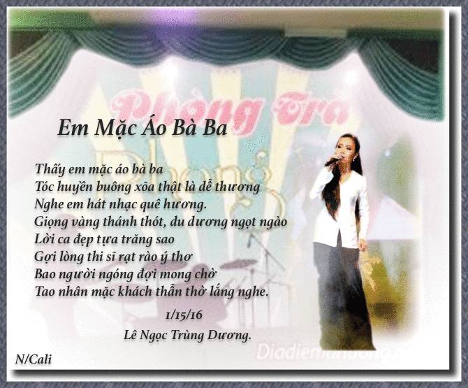 Thơ ngắn gọn, nhưng hay, mang âm hưởng của nhạc trong thơ. Hình ảnh rất chân phương với cô gái mặc áo bà ba, tóc xoả bờ vai, cầm micro hát bên giàn nhạc trên sân khấu. Khung thơ tranh thật đẹp, có sự sống vì nó diễn đạt trọn vẹn được ý thơ. Cám ơn hai vị. Phương Võ.