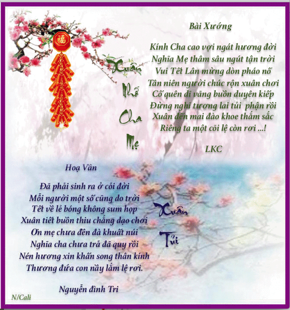 1) Cha mẹ sinh ta sống ở đời, Làm con phải đạo biết ơn trời. Ly hương đón Tết không nồng ấm, Hải ngoại mừng Xuân chẳng thiết chơi. Dĩ vãng vàng son đau kỷ niệm, Tương lai tím đỏ khổ thân rồi. Bạn bè lúc trước ai còn mất, Tóc bạc da mồi mắt lệ rơi !