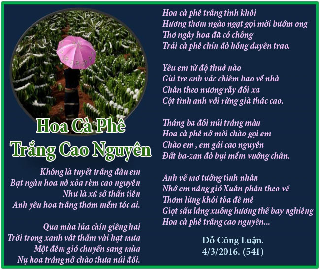 Một khung thơ tranh trình bày đẹp với lời thơ mượt mà ,nhẹ nhàng, thông thoáng và rất trữ tình đưa người thưởng ngoạn vào mùa hoa cà phê nở trắng vùng cao nguyên,nơi mà tác giả đã . "Cột tình anh với rừng già thác cao " Để rồi khi về mơ tưởng tình nhân,cô em gái đất cao nguyên Ba-zan. Thơ pha chút lãng mạng dễ thương. Thân mến .Cám ơn Giang Võ
