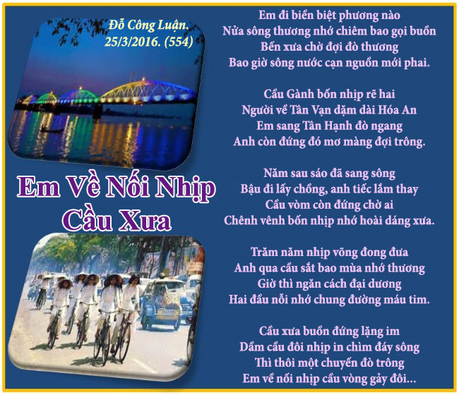 Xin cám ơn BĐH trang nhà đã giới thiệu bài thơ. Xin cám ơn vi hữu Giang Võ đã chia sẻ. Cầu xưa, ngày trước bọn chúng tôi đi học trường tỉnh, phải đi xe đạp hoặc xe lam. Những mối tình học trò hợp tan. Giờ đây, cầu xưa đã sập. Buồn quá...ĐCL