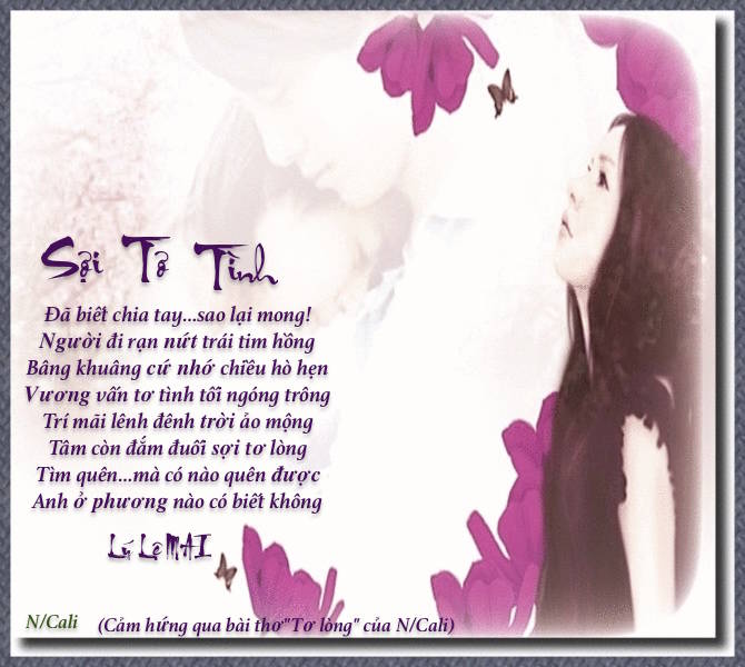 Cám ơn tác giả Lý Lệ Mai đã cho đọc những vần thơ đẹp với tình cảm nồng nàn thật dễ thương, nói lên cái tâm lý thường tình khi đã yêu. " Tìm quên...mà nào có quên được. Anh ở phương nào có biết không " Kỹ thuật ghép hình thật đẹp, đã giúp người thưởng ngoạn thấy được sự hài hòa giữa Thơ và Tranh. Thân chào. Cám ơn. Giang Võ