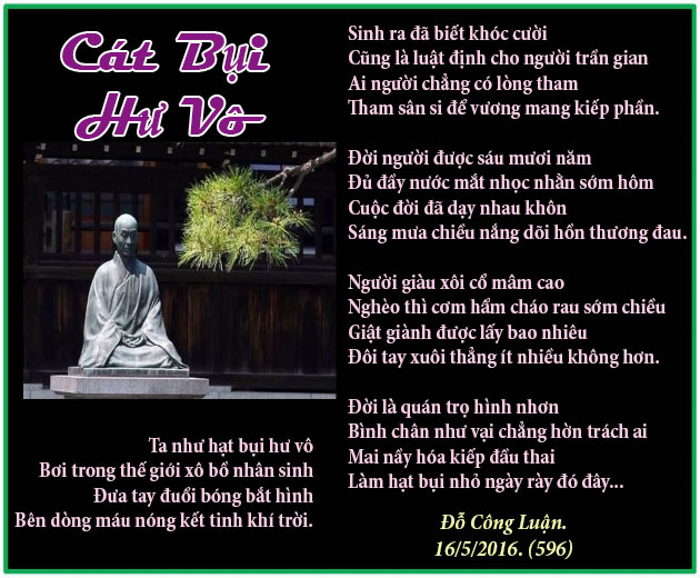 Mấy tỷ con người trên trái đất là mấy tỷ ưu tư trong cuộc sống, không ai giống ai. Vì vậy xã hội loài người vẫn trong vòng lẩn quẩn hỉ nộ ái ố, và tranh ăn. Bao giờ có một xã hội hoàn mỹ, dù biết rằng hư vô lại về với hư vô. Cát bụi về cát bụi....ĐCL
