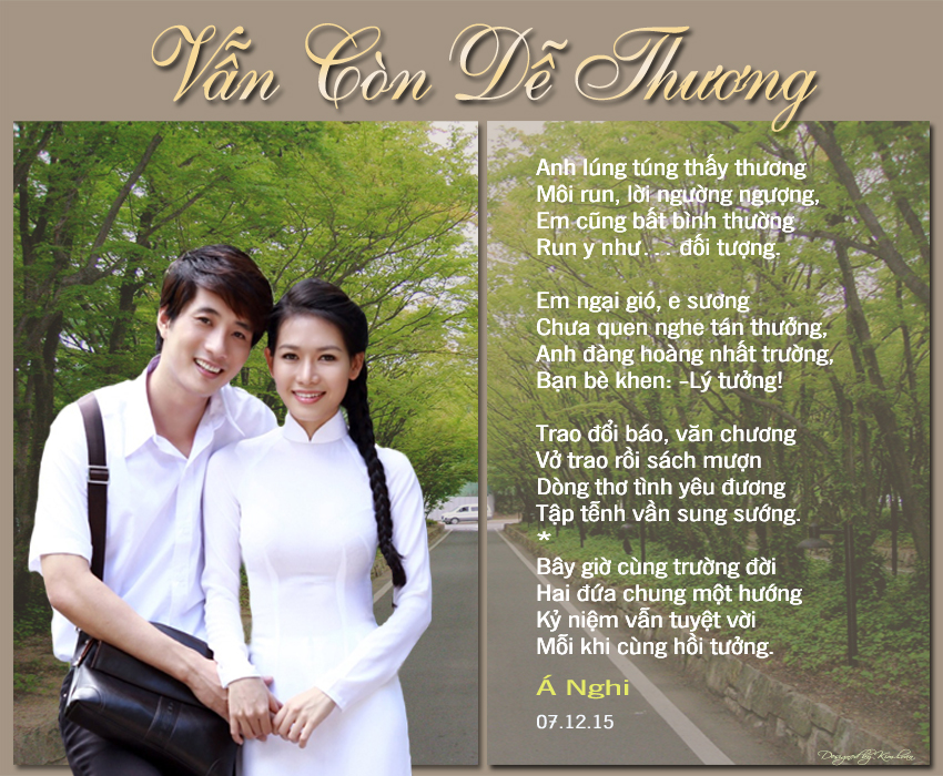 Vẫn Con Dễ Thương là một trong những bài thơ hay tả những vụng dại thủa học trò. Những điều Á Nghi mô tả chắc chúng ta ai cũng hơn một lần trải qua nhưng vì ngượng ngùng không muốn nhắc đến. Mọi người như muốn quên đi những vụng dại thủa học trò. Á Nghi dám ghi lại những nét ngây thơ vụng về đó khiên khi đọc ta cảm thấy thích thú.Kim Loan cho chúng ta ngắm bức tranh tuyệt đẹp: Đôi Nam nữ trong vườn cây tĩnh lặng như muốn nói lên ở đây chỉ có chúng ta mà thôi. Cám ơn Á Nghi, Kim Loan Thân chào, Nguyễn Thành Sơn