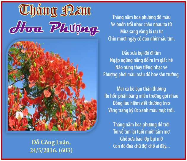Nhìn hình hoa phượng cùng ý bài thơ đã gợi lại trong tôi những kỹ niệm khó quên về tình cãm mộng mơ của thời cắp sách cùng cảnh tạm biệt đầy lưu luyến trong những ngày hè. Cám ơn. Phương Võ.