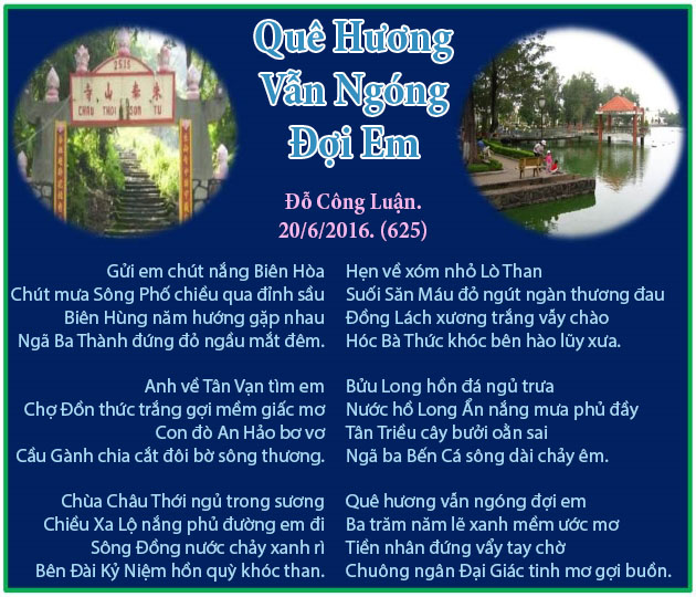 Đỗ Công Luận có công ghi tất cả danh lam thắng cảnh của quê hương Biên Hòa. Ai muốn du lịch Biên hòa nên tìm đọc trước bài thơ của thi sĩ Đỗ Công Luận để nắm rõ một số đia danh như:chùa Châu Thới,Bửu Long; suối Máu,hóc Bà Thức. Tôi có một thắc mắc nhờ bạn Luận giải đáp giùm. Ở vùng từ Long An xuống đến Cà Mau để chỉ nơi xa xôi hoang vắng người ta thường nói "Hóc Bà Tó" xin hỏi Luận phải hóc Bà Thức cũng là Hóc BàTó là một địa danh mà hai tên? Phần kết, câu chót chỉ có bảy chữ nghe không thuận chắc là lỗi của ấn công. Thân chào, NTS